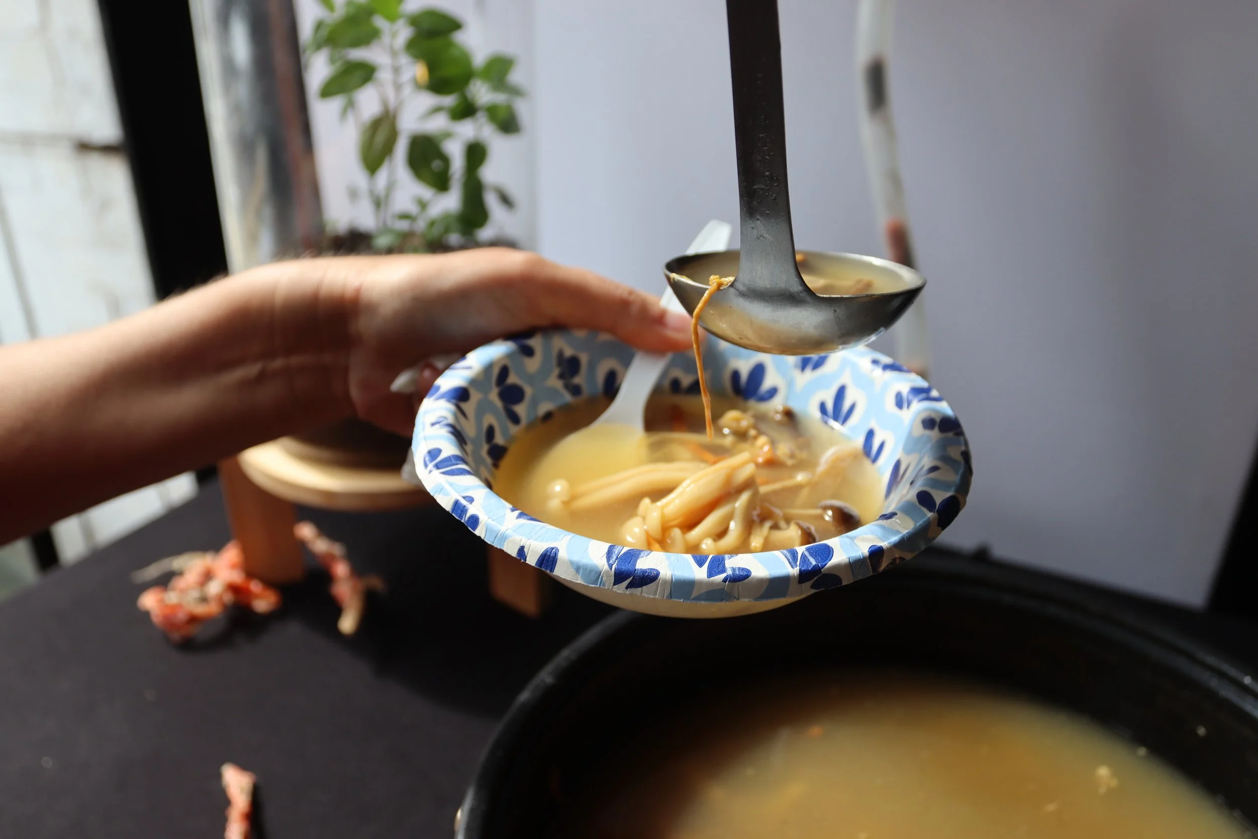 Cordyceps militaris, mushroom medley, chicken bones, ginger, water, shaoxing wine, salt, hot pot, soup ladle, bowl, you